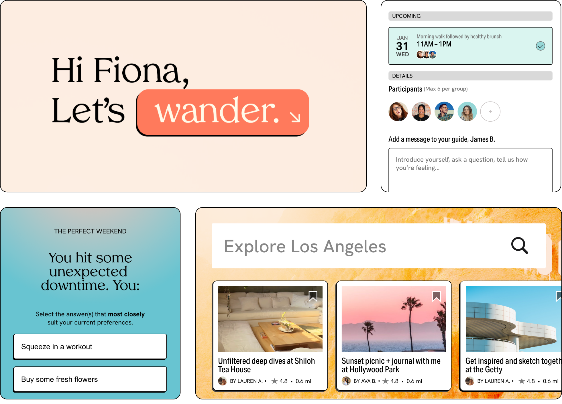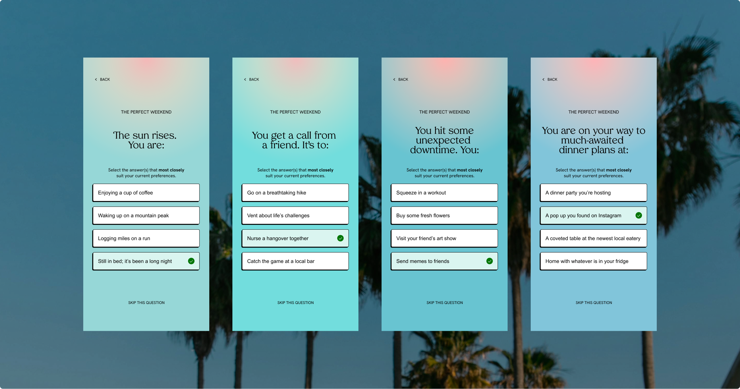 In order to match people and activities by shared interests and values, I explored an onboarding process that mimics a dynamic personality quiz, considering how to extrapolate a newcomer's behavior and interests in order to serve personalized recommendations. This would require some technical "guesswork" which challenges my desire for precision, but it aligns with the design principle of making things feel easy, conversational, and delightful.