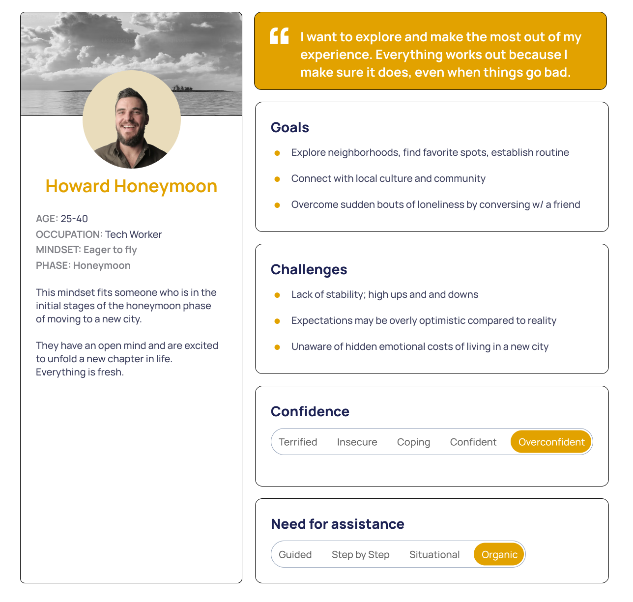 Instead of personas, I used Designit's "mindsets" framework which help frame the spectrum of emotional responses one might experience within the same context. These mindsets are designed to model how attitudes of a person might fluctuate and/or evolve over time.