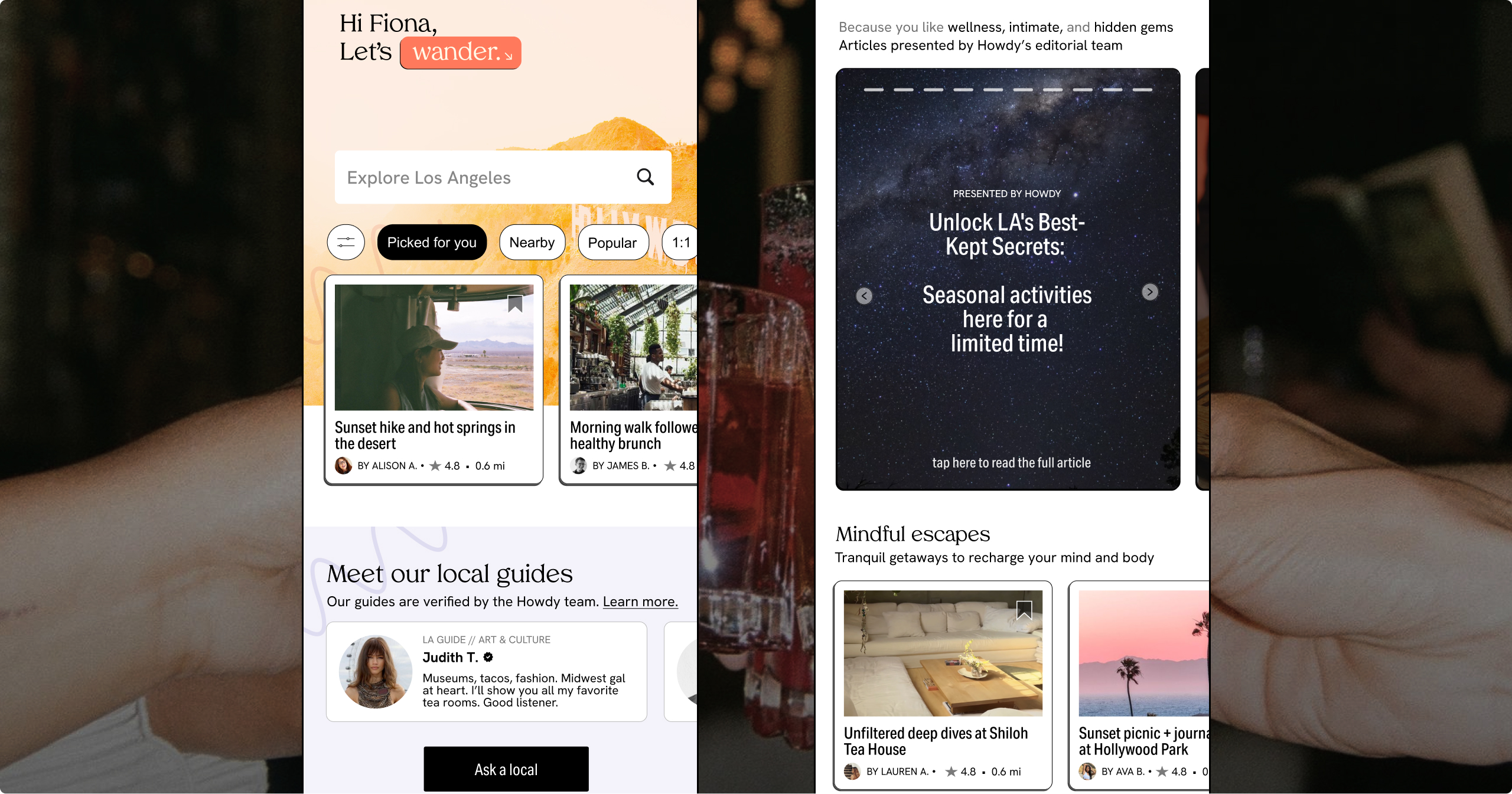 Howdy is a marketplace linking newcomers with locals via curated experiences. Locals serve as city hosts, offering tailored itineraries to acclimate newcomers to their new city and culture. Newcomers can access events, connect with locals, and seek guidance